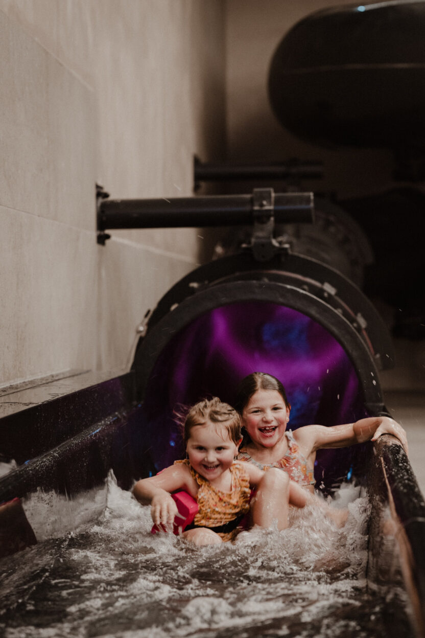 Our family spa is a place where children can romp around and parents can relax. While the kids conquer the slides and the toddler pool, parents can swim laps in the warm indoor pool or enjoy some time out in the textile sauna. Comfortable lounging areas, family cabins, and a refreshment bar ensure comfort. Large panoramic windows bring nature indoors—for carefree moments of well-being surrounded by greenery.