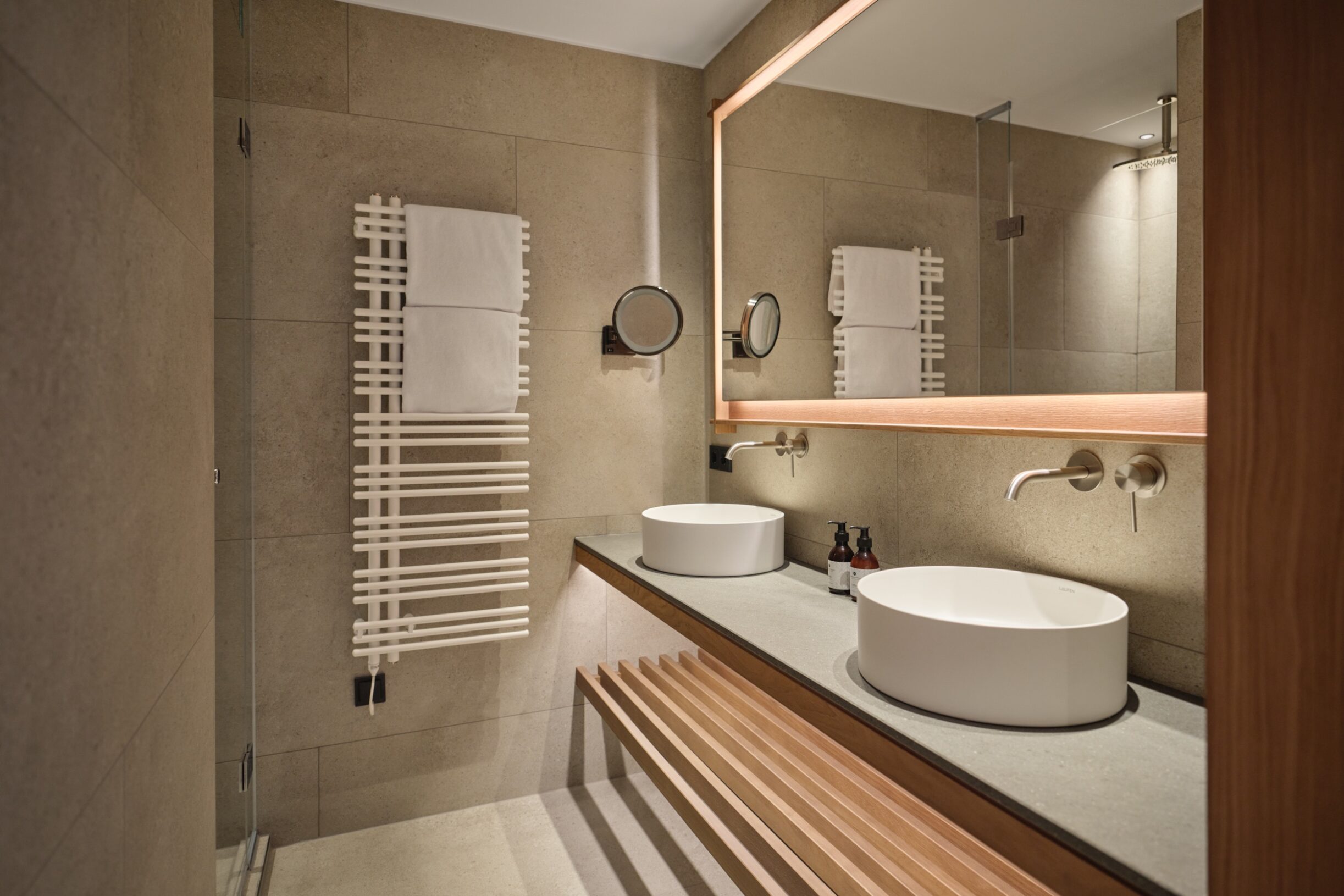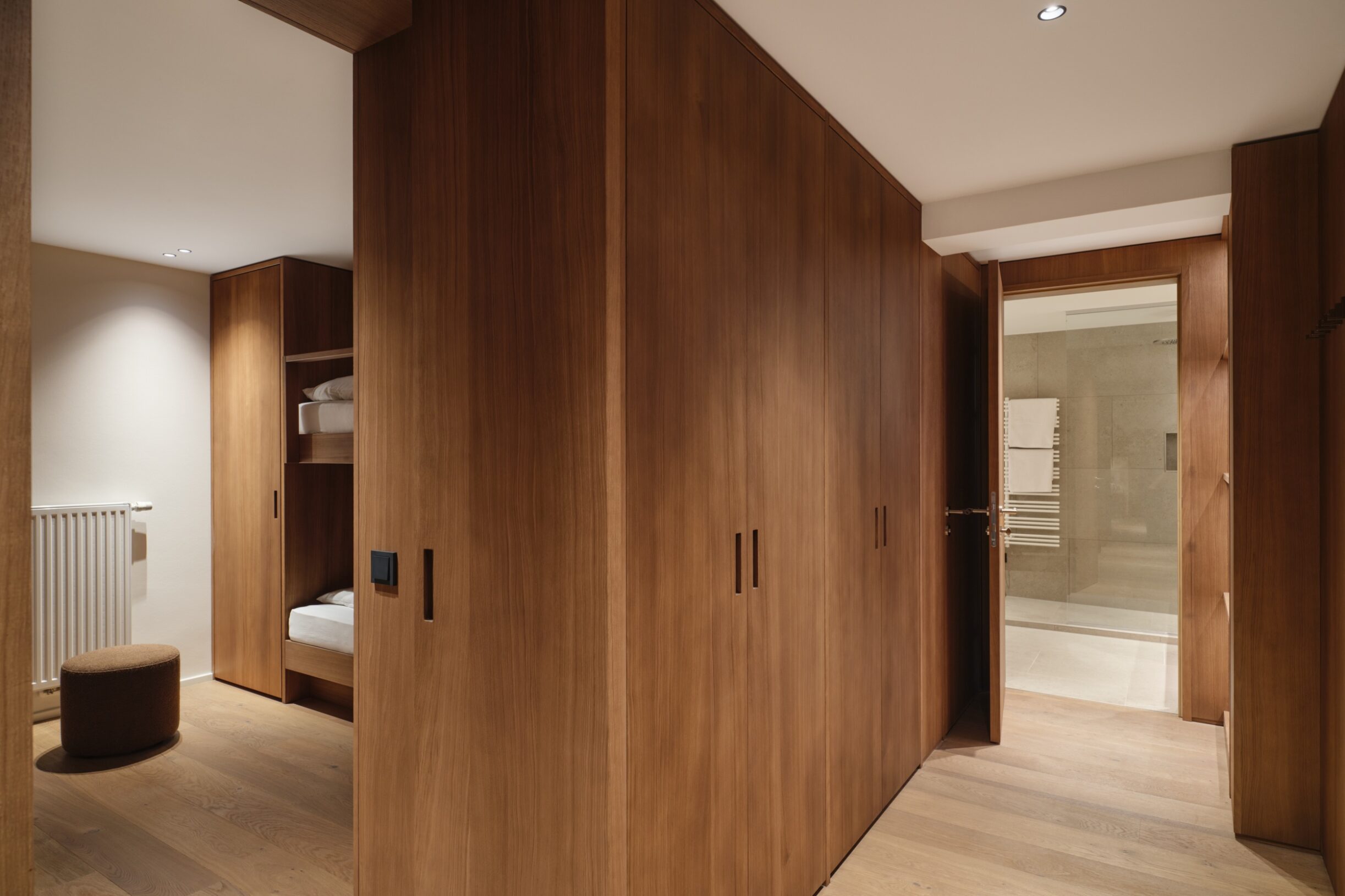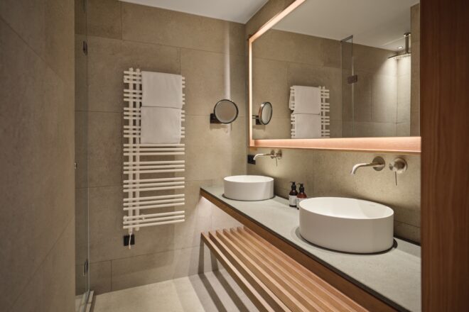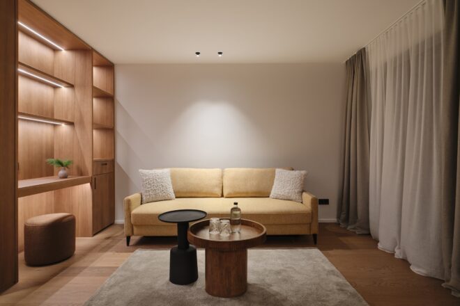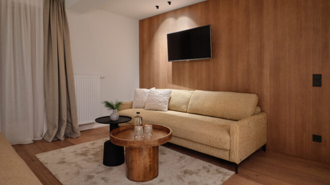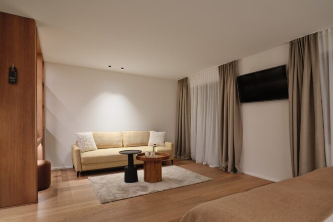 Familiensuite SaraMit der Wiedereröffnung des Oberforsthof ergänzen neue Räume das Haus auf zeitlose Weise. Sara steht für einen eigenständigen, ruhigen Stil: klar, hochwertig und bewusst zurückhaltend. Cognacfarbene Eiche, erdiges Ocker und sanfte Beigetöne prägen das reduzierte Design und schaffen eine natürliche, ausgewogene Atmosphäre. Und da Hansi nicht allein reist, gehört Sara ganz selbstverständlich dazu. Stilvoll, eigenständig und sehr stimmig.