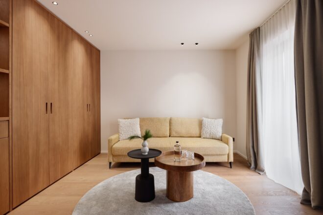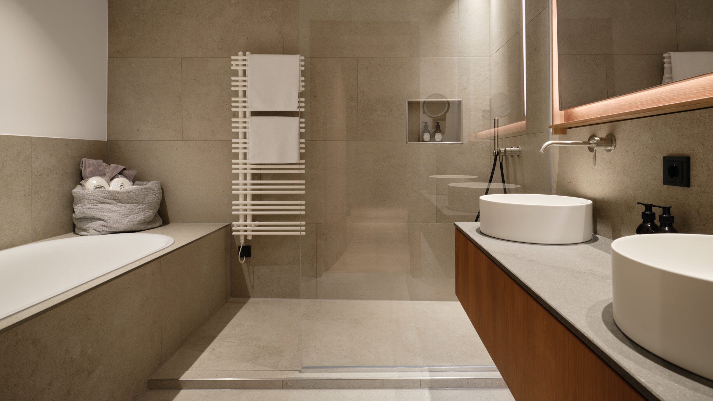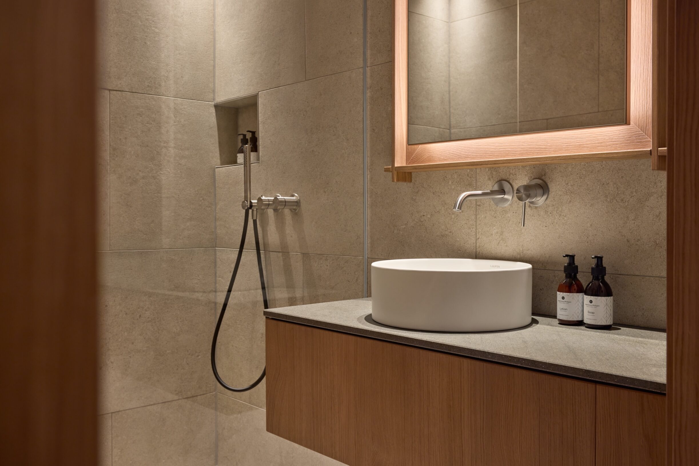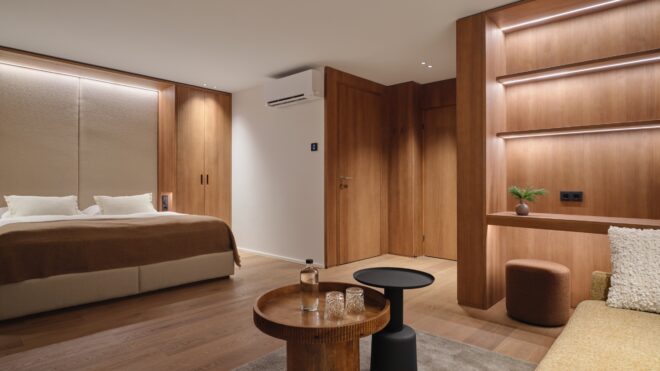 Familiensuite SaraMit der Wiedereröffnung des Oberforsthof ergänzen neue Räume das Haus auf zeitlose Weise. Sara steht für einen eigenständigen, ruhigen Stil: klar, hochwertig und bewusst zurückhaltend. Cognacfarbene Eiche, erdiges Ocker und sanfte Beigetöne prägen das reduzierte Design und schaffen eine natürliche, ausgewogene Atmosphäre. Und da Hansi nicht allein reist, gehört Sara ganz selbstverständlich dazu. Stilvoll, eigenständig und sehr stimmig.