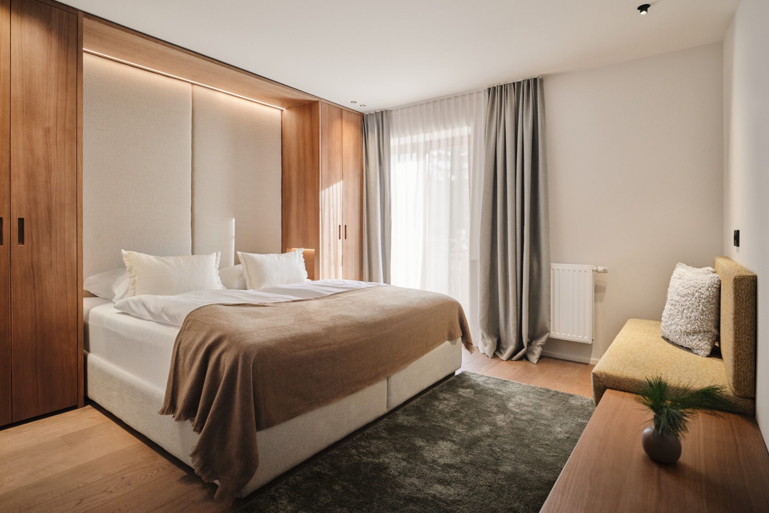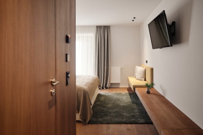 Doppelzimmer Rupi PLUSHeimelig, ruhig und voller Wärme - diese Eigenschaften treffen auf all unsere Rupi-Zimmer zu. Neben Premiumbetten sorgen individuelle Sitzgelegenheiten, ein möblierter Balkon/Terrasse in Richtung Innenhof und viele schöne Details für hohen Wohnkomfort. Sanftes Licht, Echtholzböden und -inventar in Kombination mit hellen Farben machen das Wohlfühl-Ambiente perfekt. Hier haben Sie handfeste Aussichten auf einen unbeschwerten Urlaub in den Bergen. So wie Rupi sie euch gewünscht hätte.