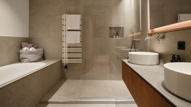 70 bzw. 90 m², für 2-4 Personen, Wohnraum, XXL-Badezimmer mit Whirlwanne und private Sauna